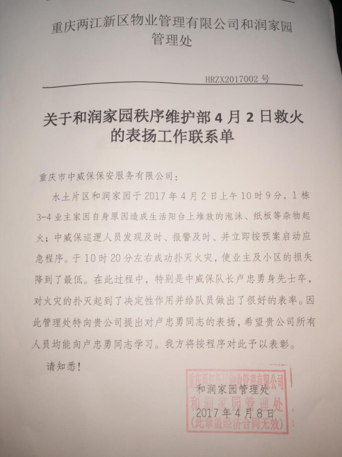 2017年4月2日上午10時(shí)9分,中威保駐和潤(rùn)家園小區(qū)保安員巡邏時(shí)發(fā)現(xiàn)1棟業(yè)主起火情況,及時(shí)報(bào)警,并立即按預(yù)案啟動(dòng)應(yīng)急程序,只花了11分鐘的時(shí)間就把火撲滅了,使業(yè)主及小區(qū)的損失降到了最低。在此過(guò)程中,分隊(duì)長(zhǎng)盧忠勇身先士卒,對(duì)火災(zāi)的撲滅起到了決定性作用,并給隊(duì)員做了好的表率。因此甲方特發(fā)來(lái)表?yè)P(yáng)信對(duì)盧忠勇表示了贊揚(yáng)。